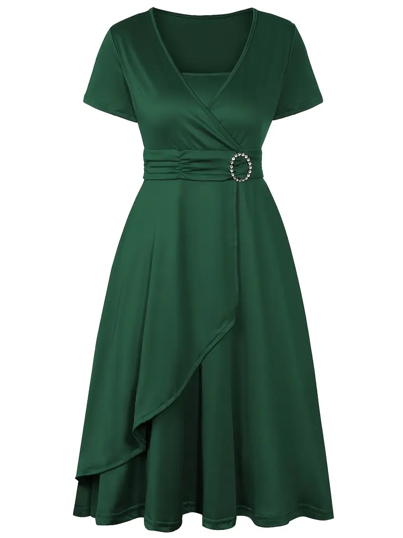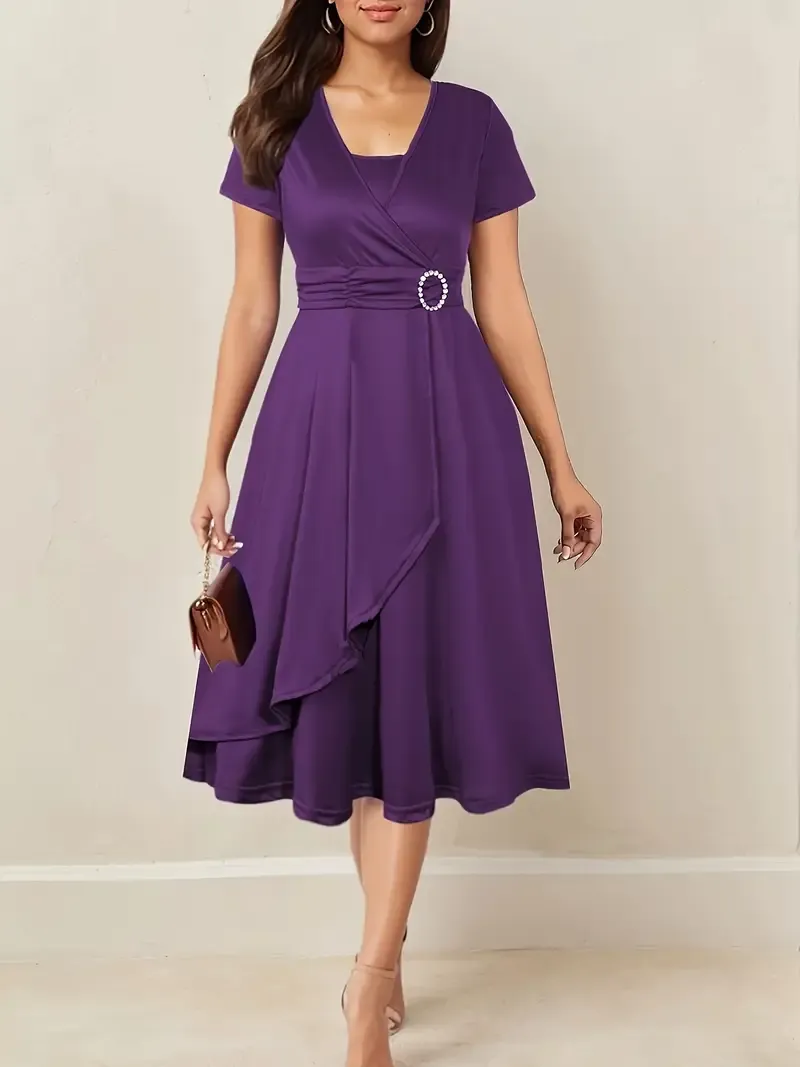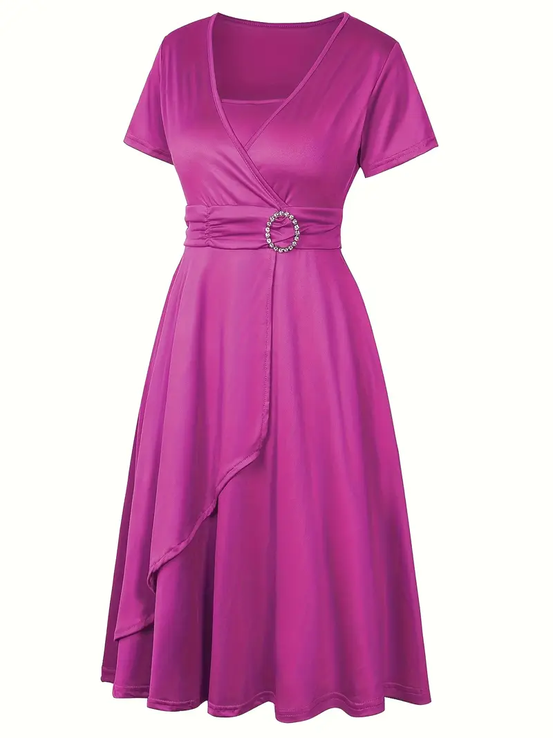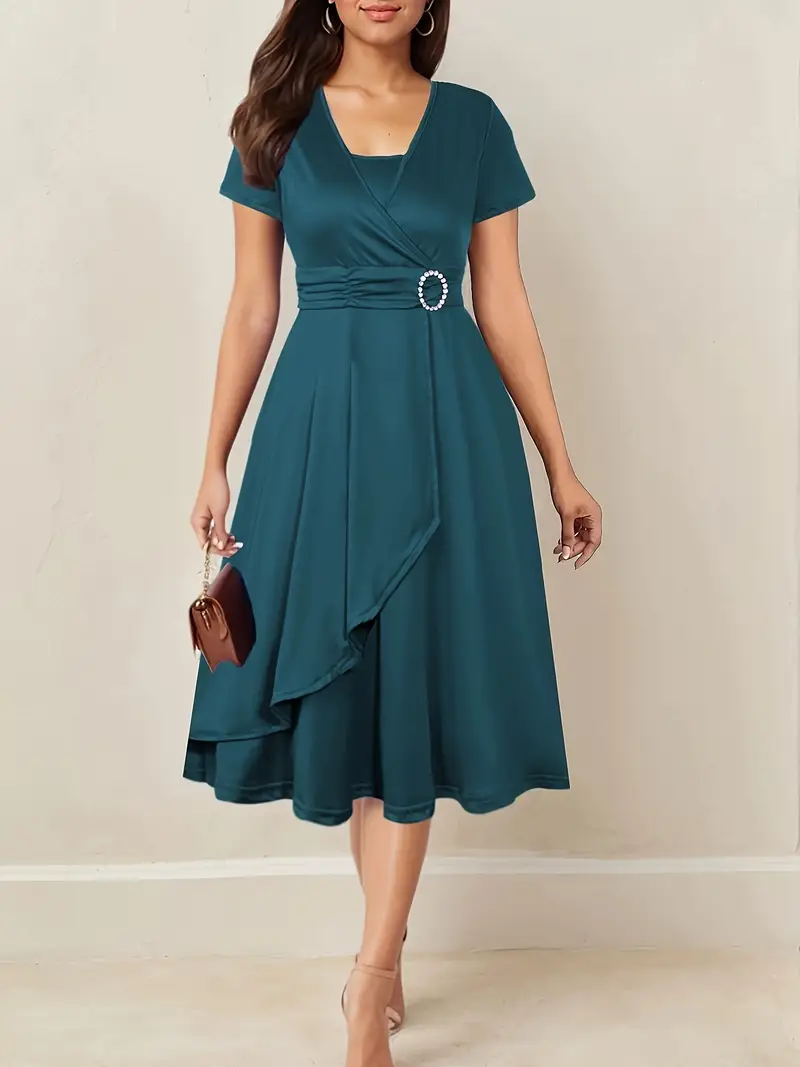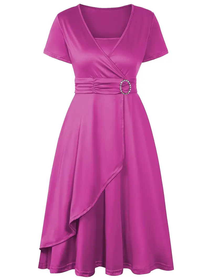 Krótkie rękawy, Dekolt w kształcie litery W, Asymetryczny dół, Jednolity kolor, Mieszanka poliestru, Można prać w pralce, Elegancka sukienka midi z talią na krzyż