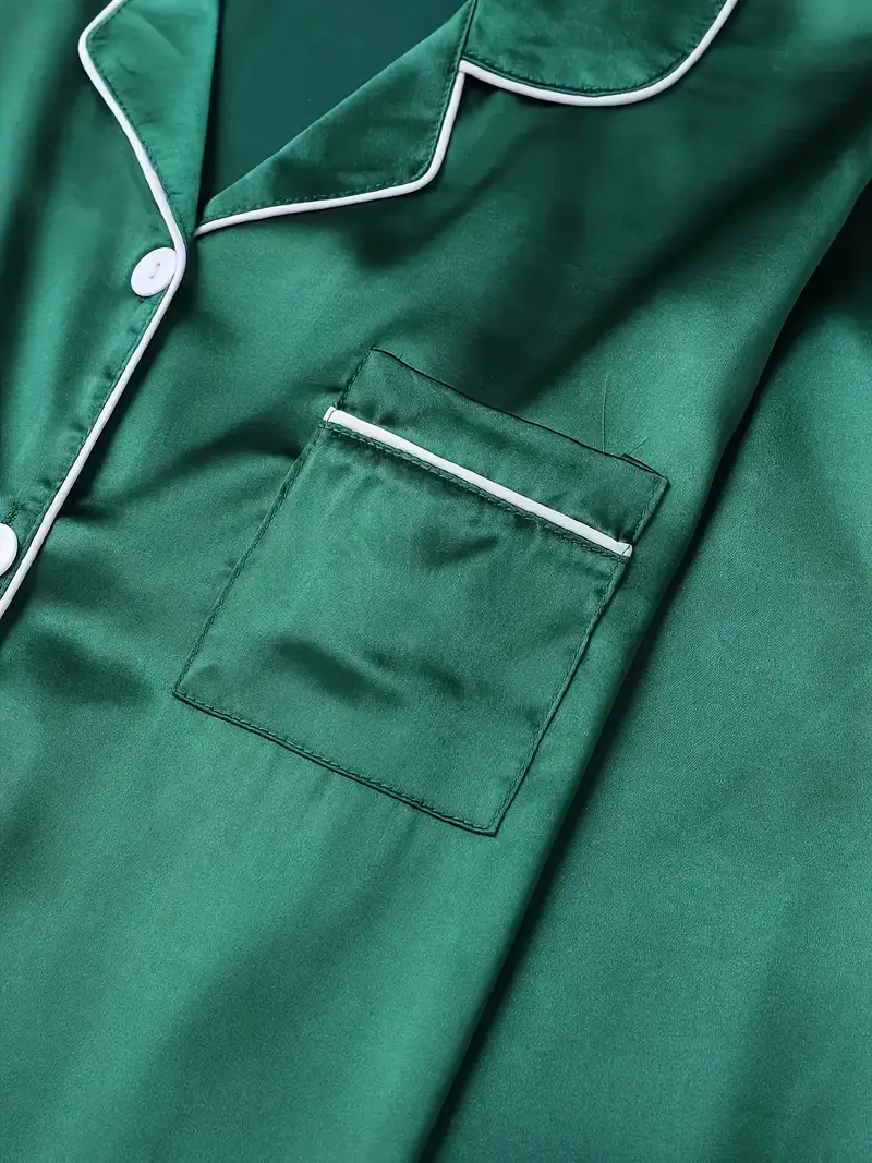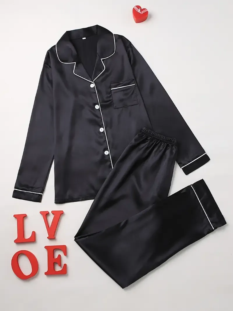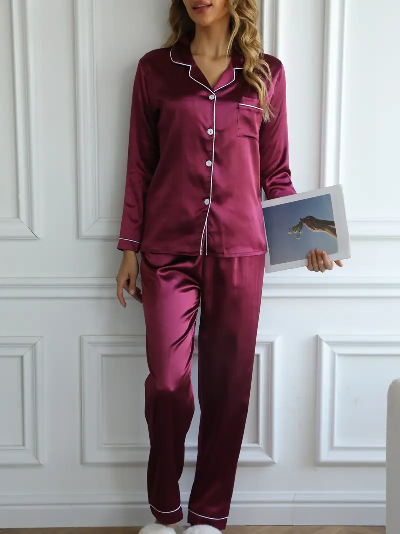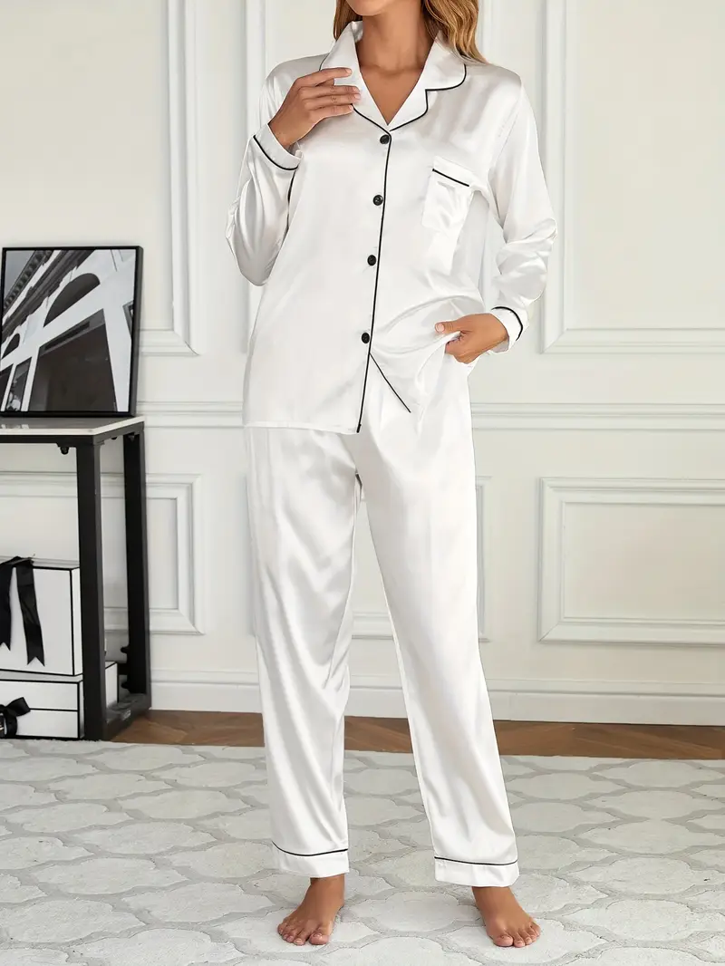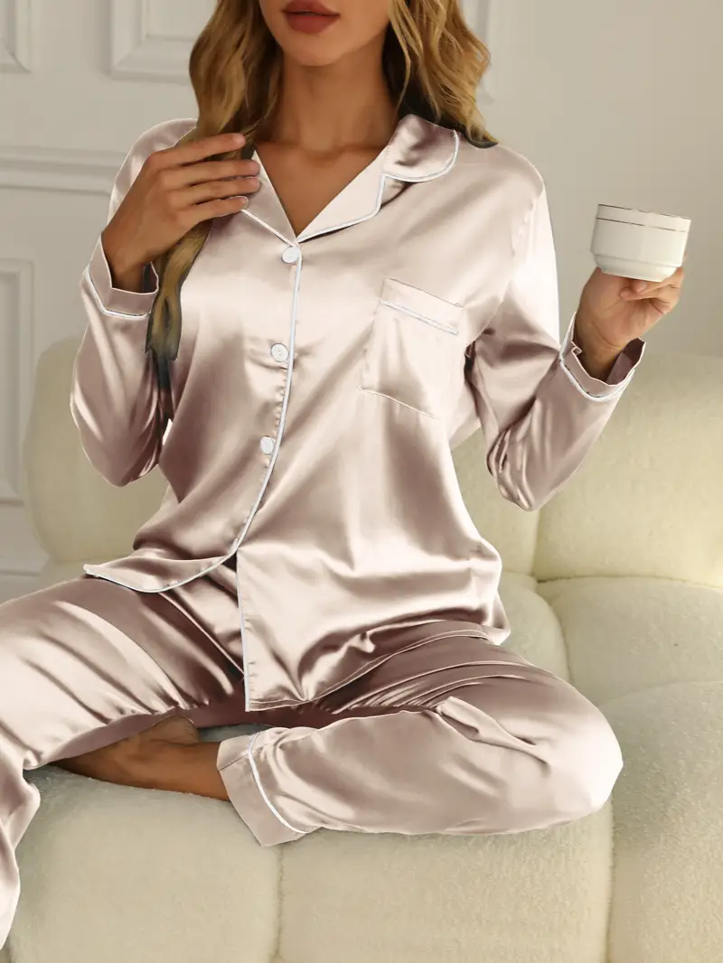 Damski Komfortowy Komplet Pizamy – Długie Rękawy i Klapy na Guziki (Bielizna Nocna & Domowa